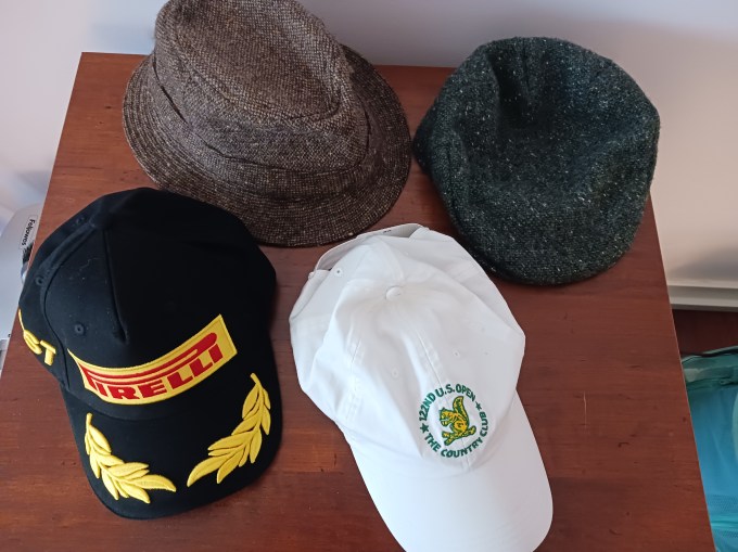 Three are from Hanna Hats of Donegal, Ireland. One has a brim; the other two are the classic caps one sees most often on Irish heads. As a member of the United States Golf Association (USGA), if I pay my dues, I get that year’s US Open cap. Not sure how many of these I have; most are in the trunk of my car along with my golf clubs. I also have a Pirelli cap, a gift from my son. We share an interest in Formula I auto racing, and Pirelli is the tire supplier for the series. It’s a bit snazzier than most, with gold leaves on the bill!